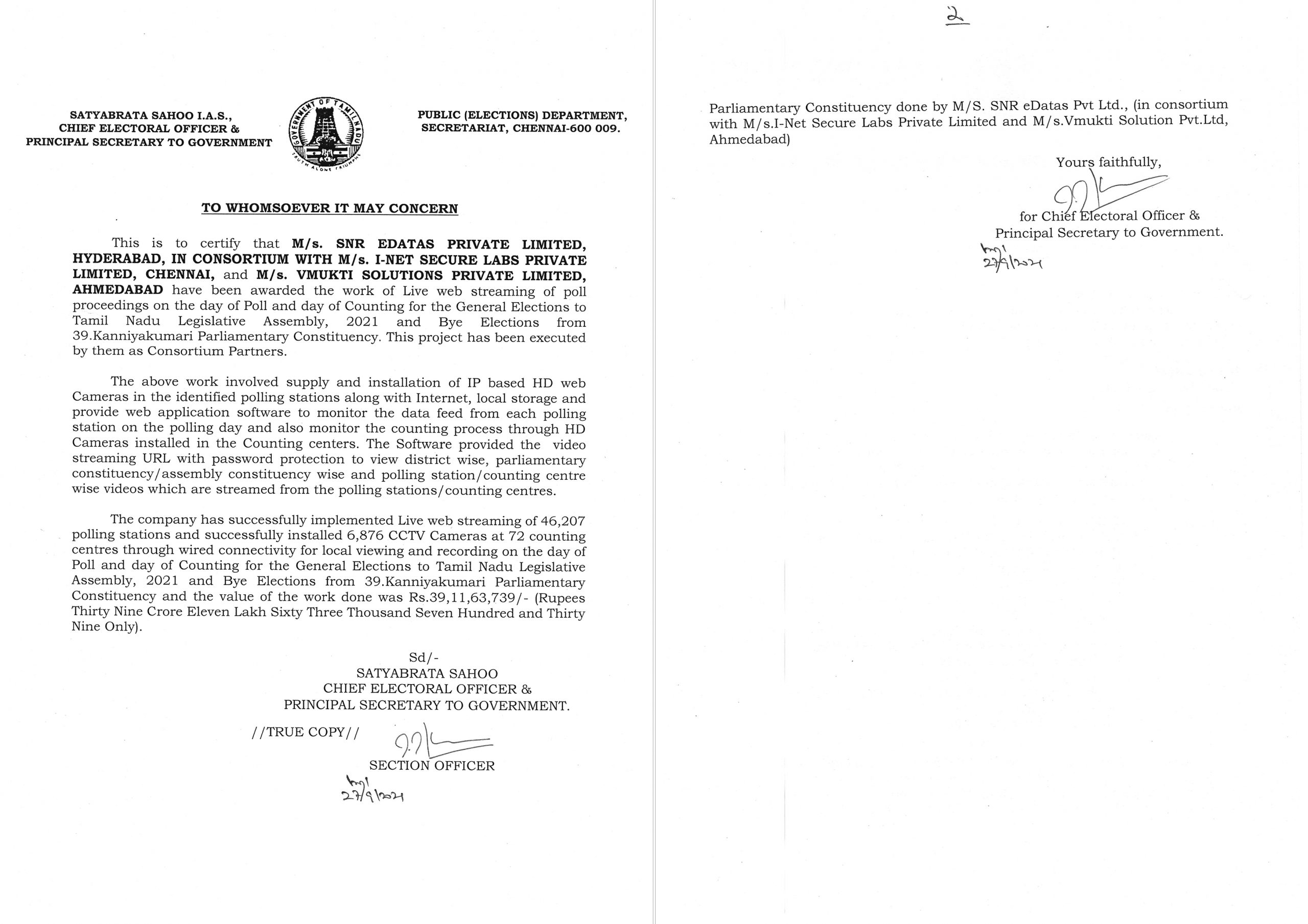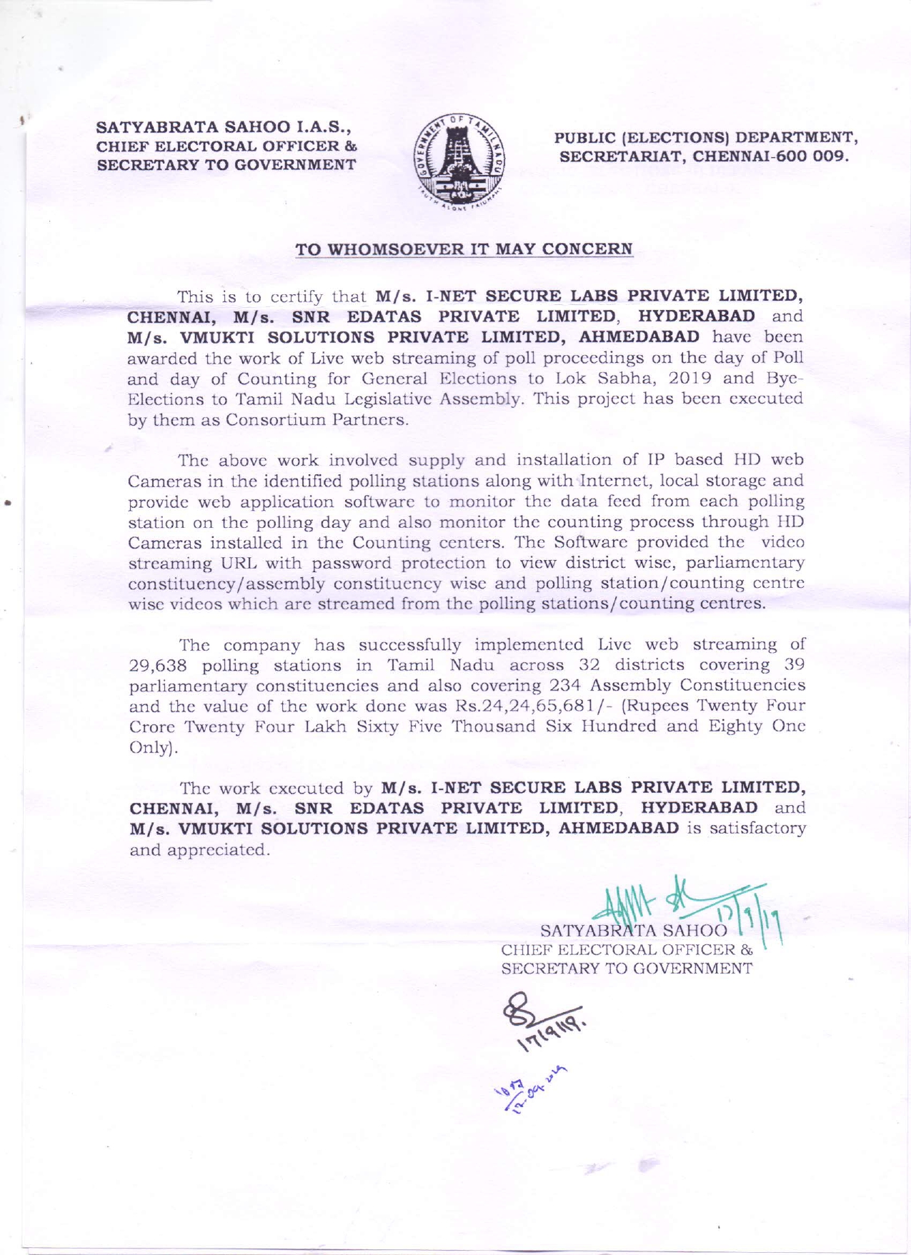 General Elections to Lok Sabha – 2019 Managed and executed the project of Live Web Streaming of covering 850 polling stations of Vellore Parliamentary Election and 100+ Cameras in Counting centre.