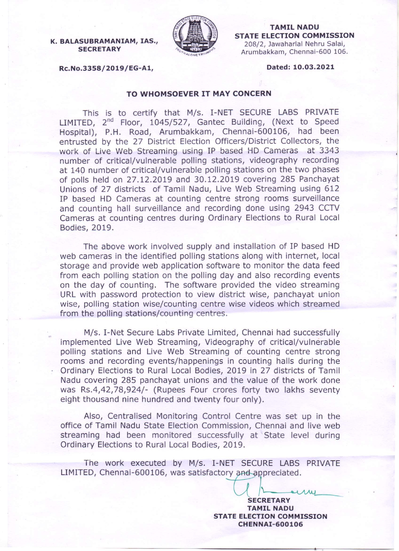 Tamil Nadu Local Body Elections 2019-20 – I-Net has managed and executed the Live Streaming for 27 Districts in Tamil Nadu. To live monitor polling and counting events for around 7000+ Camera has been deployed successfully. It was centralized monitored by State Election Commission of Tamil Nadu.